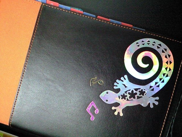 で、使い慣れている見開き1か月カレンダー式のA5に落ち着きました。カバーは文具屋さんで見つけた安価なものに、ハワイのお土産にいただいたヤモちゃんシールを張ってみました。