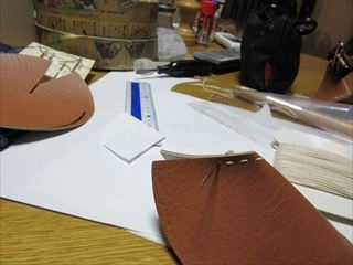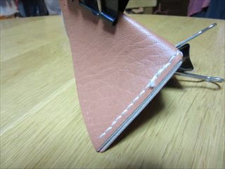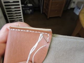 角のところだし、太すぎたために縒りをほどいたタコ糸を使ったため、かなり縫いにくかったです。(すぐ結び目が出来てしまうし、針を内側から、穴をあけた場所にうまく刺すのがなかなか難しかった。)