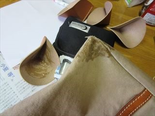 さあ、縫い付けです。まずは皮・布用のボンドで縫う部分の奥を固定。