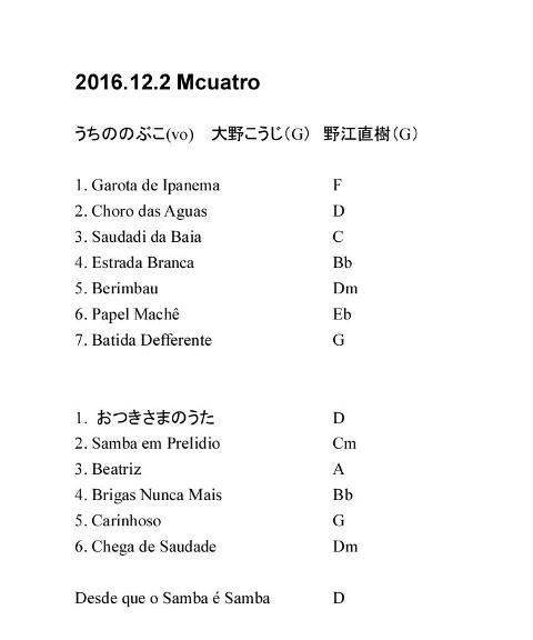 Mクアトロに来てくださった皆さま、ありがとうございました。大野こうじさん、野江直樹さんのtwin guitar(+大野さんのフルート)と一緒にお送りするブラジリアンライブ、今回3回目でございました。楽しんでいただけたでしょうか?
