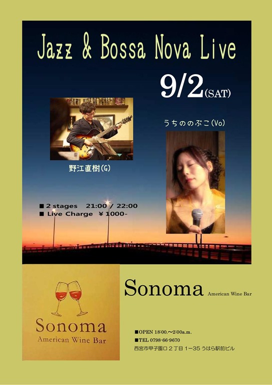 JR甲子園口南口すぐ。ケンタッキーの隣のお蕎麦屋さんの2階です。とってもおしゃれで素敵なワインバーです。ワインの種類も豊富、なんと午前2時まで営業!是非ワイングラスを傾けながらJAZZをお楽しみ下さい。野江さんとは初めてのDUO、楽しみです。