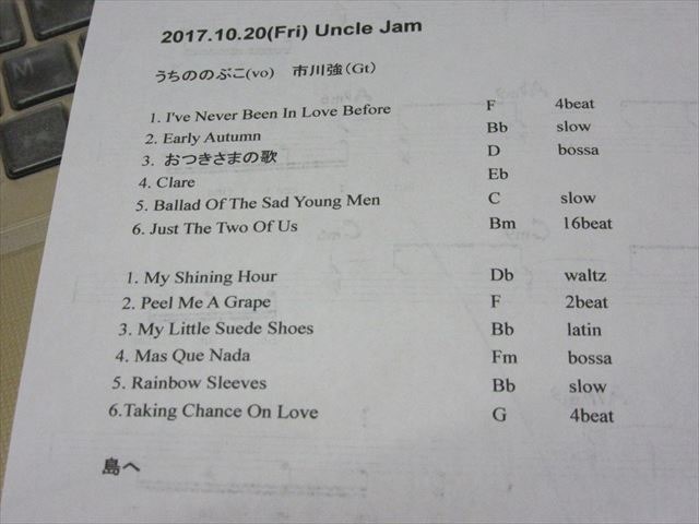 Uncle Jamでのライブに来てくださった皆様、ありがとうございました。たくさんのお客様が来てくださいました。本当に何年ぶりというお客様もいらして、お元気そうなお姿に安心いたしました。また、最近甲子園口界隈に引っ越してこられた素敵な女性、ジャンルを問わずライブに行くのが大好きということで、2度目のUncleJam、予定表を見て「これに行ってみよう」とうちののライブを選んでくださったとのこと、本当にうれしい限りです。