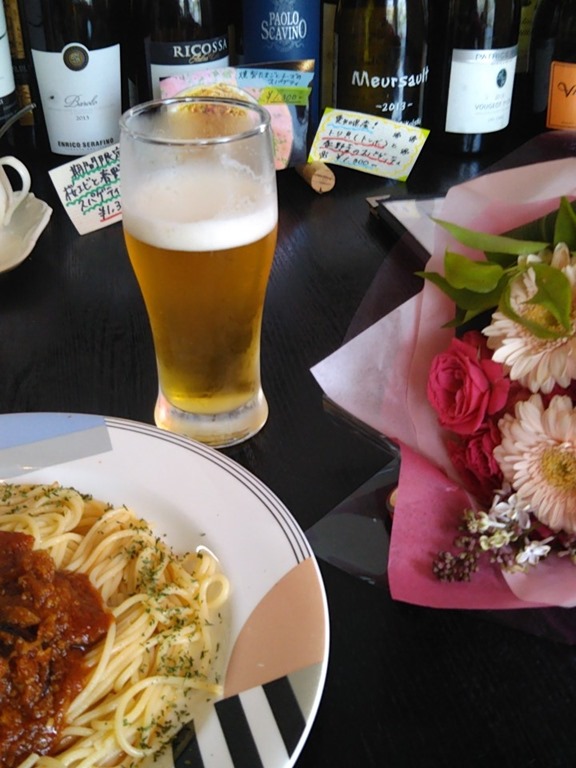 パスタで一人打ち上げ・・。いただいたお花と一緒に。