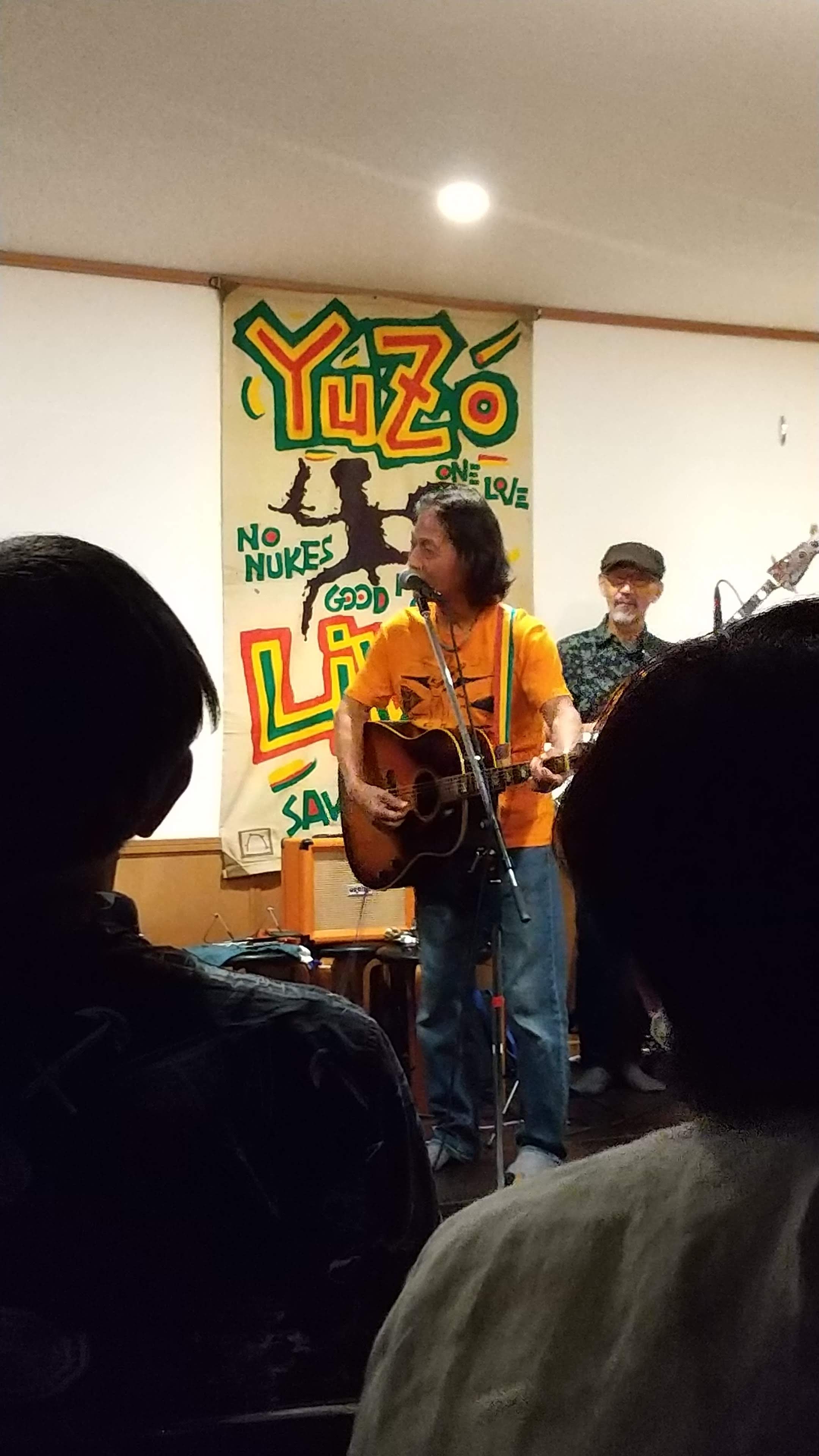 3組の出演バンドのトップバッターだったのです。2組目のバンド演奏は撤収して少し休憩して・・・で聴くことができなかったのですが、3組目の豊田勇造さん率いる「YUZO BAND」は会場で聴かせていただき、なんと最後は舞台で一緒に歌わせていただきました。