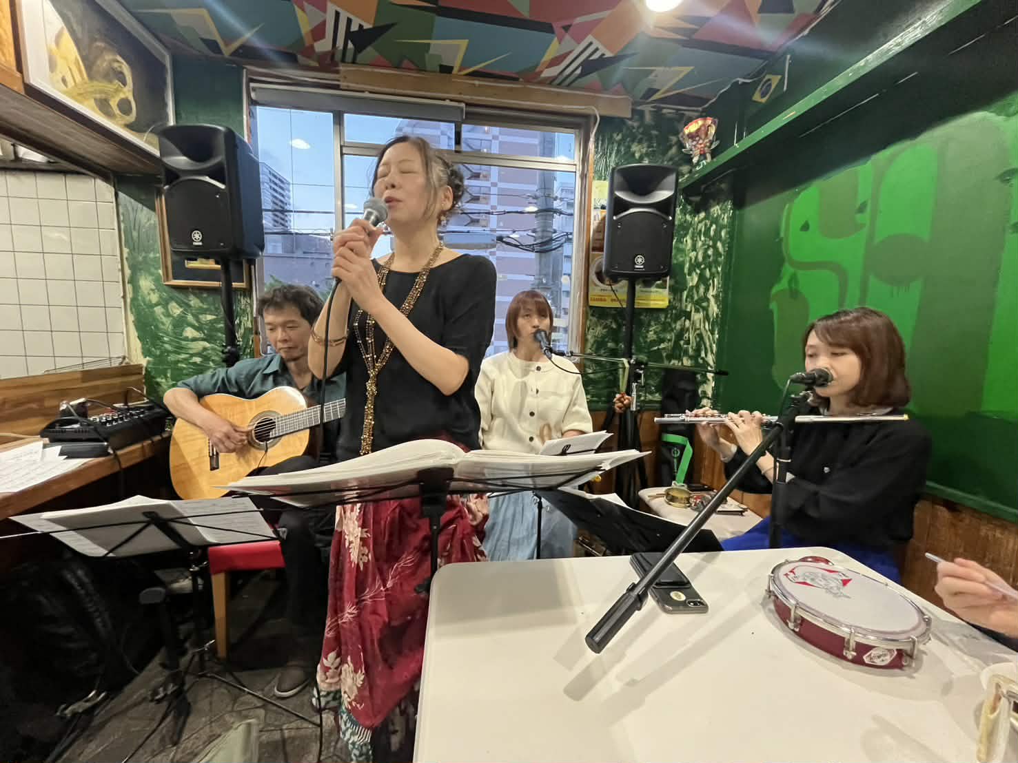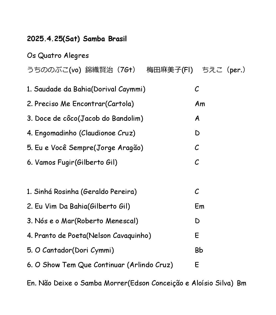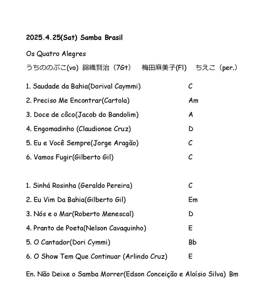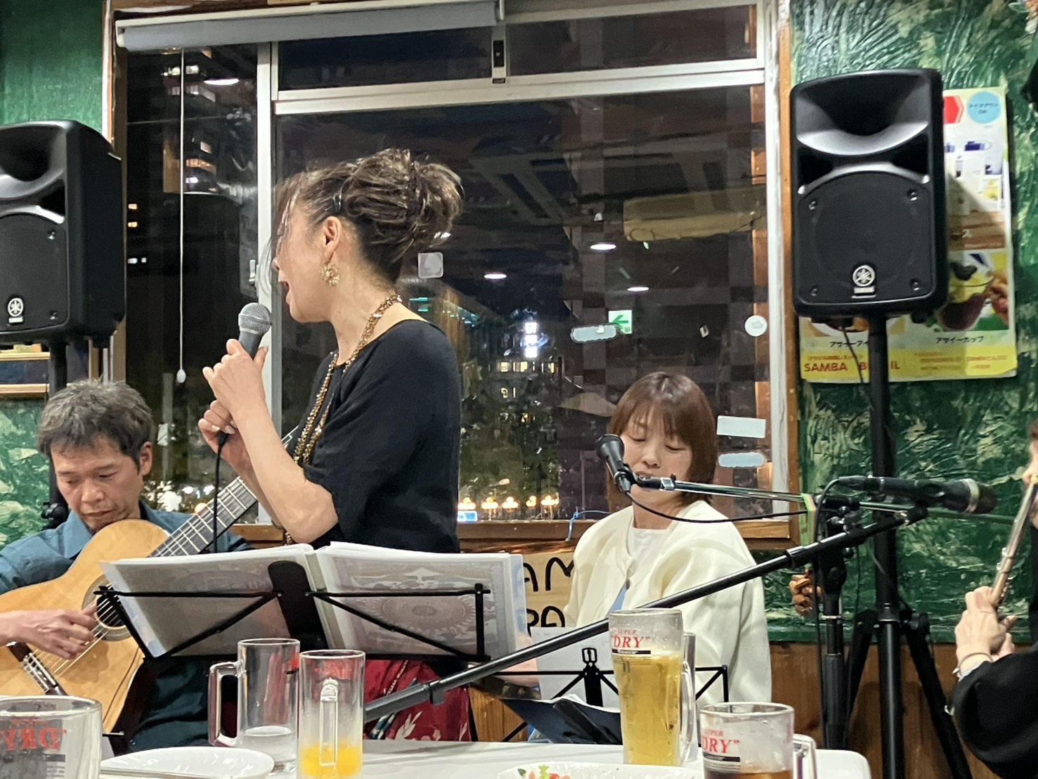 Samba BrasilでのOs Quatro Alegresライブに来てくださった皆様、ありがとうございました。告知後しばらくご予約がなくて心配しておりましたが、結果的には椅子が足りなくなってシェフのキャンプ用の椅子が出てくる、という満員御礼でございました。メンバーといつもショーロの演奏をしている藤倉洋子さんも来てくださり、1曲ショーロを演奏くださいました。お集まりくださった皆様には本当に感謝しかございません。歌う喜び、音楽を皆さんと分かち合う喜びに満ち溢れた至福の時間でございました。