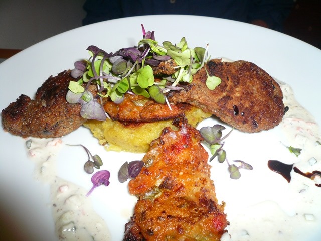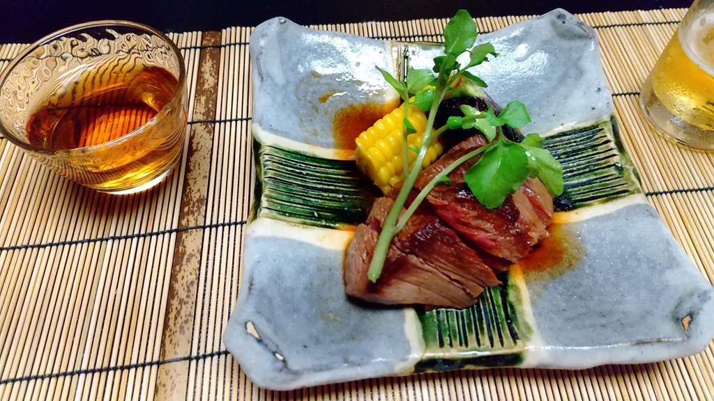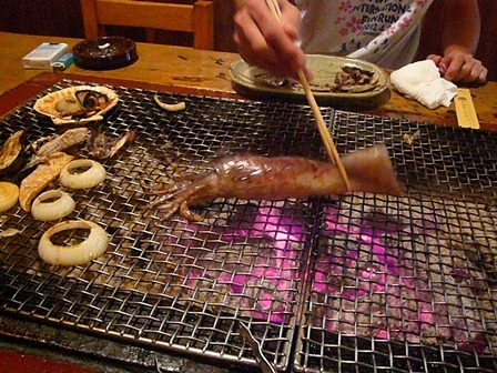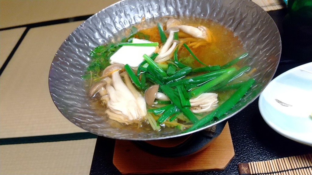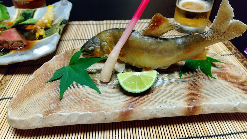 お食事は岐阜の味覚てんこ盛り。飛騨牛のステーキ、鮎の塩焼き、健豚(ケントンと読むのだそうです)のしゃぶしゃぶ。