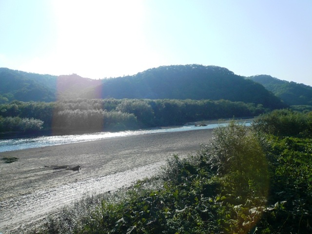 大体、お昼に戻ってくるぐらいの距離の見当をつけて、まずは釣りをせずに川を下っていきます。(川釣りは、可能であれば、上流に釣り上がるのが良いのです。どうしてかって?魚は川の中ではたいてい上流を向いているんですね。流れてくるえさを待ち構えているのです。ですから、上流から下流に向かって釣りをすると、先に魚に人の気配を悟られやすいのです。車を河原に置いている場合、先に歩いて下流までいってからスタートすると、帰りが楽というわけ。