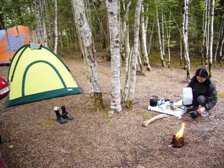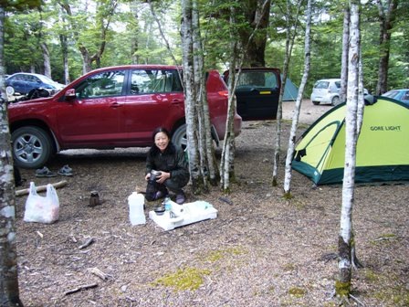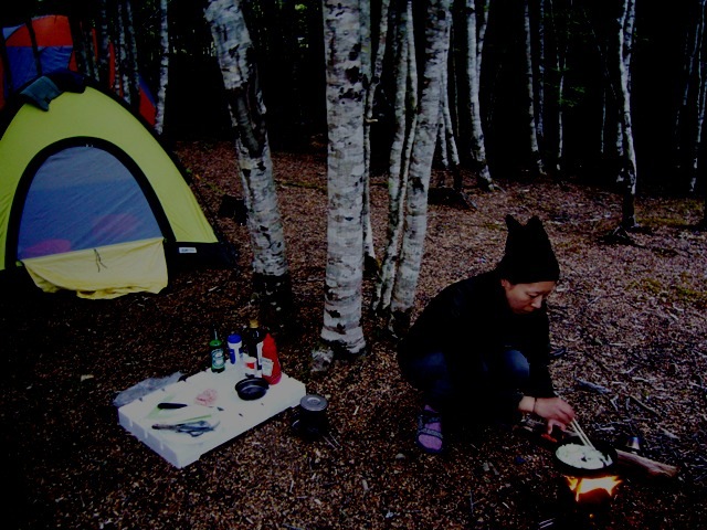 ということで、安心して野菜とハムのケチャップ炒め、インスタントラーメン(なんと出前一丁がスーパーにあった。)ニンニクの揚げ物、パン、フルーツ、という脈絡のないメニューの夕食と、ビールとワインで、楽しいキャンプの夜は更けていったのでありました。