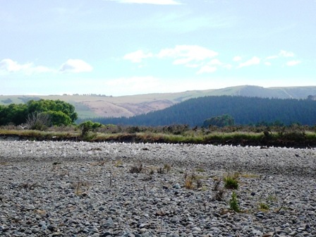 さて、まず最初のポイントに・・。農場の中に入って、河原へ出ました。Black-billed gullというカモメの一種が沢山見えます。このgull、テ・アナウ湖周辺にも沢山いますが、屋外のカフェや、ピクニックテーブルで、食べ残しなどを狙うので少々嫌われております。